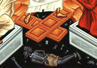 Most Resurrection icons show keys, chains, and locks scattered in the darkness, because the power of death to bind humanity has been destroyed. And in the depths of the pit, a skeletal being is sometimes shown, lying prostrate and bound up. This is Hades personified—Death and/or Satan, who has been destroyed and defeated by Christ, illustrating the truth of Hebrews 2:14, that “through death he might destroy him who has the power of death, that is, the devil.” Our Savior’s death brings life to all.